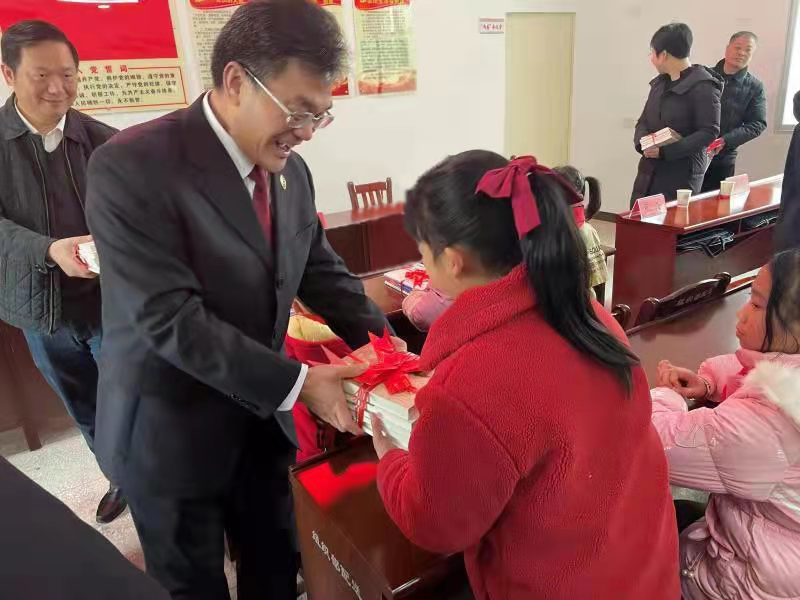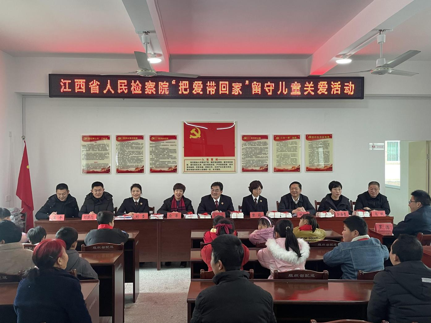 2月10日,省院机关党委组织检察干警赴乡村振兴定点帮扶村赣州市宁都县青塘镇社岗村,开展“把爱带回家”留守儿童关爱活动。活动中,与参与活动的留守儿童及监护人交流,深入了解他们存在的实际困难和需要帮助解决的问题。省院第九检察部检察官用通俗易懂的方式,向村留守儿童监护人、村两委、村妇女组长、村小学教师讲解了《家庭教育促进法》,从监护责任、教育责任、监督责任等方面强调了家庭、学校、村两委在教育未成年人中应当承担的义务。乐安县院“刘莹姐姐工作室”通过互动小游戏的方式,教给孩子们工作室编创的防性侵自护操,“宝宝有个小肚肚,上上下下要保护。如果有人向上摸,大声说出‘不不不’...”,通过唱跳结合的自护操教导孩子们学会自我防护。活动最后,向留守儿童们赠送了科普读物、书包等学习用品。