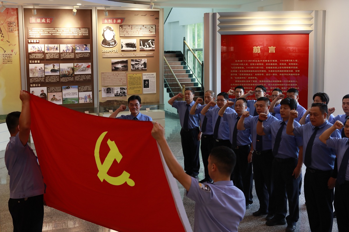在杜凤瑞纪念馆,大家用心聆听了“空军英雄战士”杜凤瑞先后击落两架敌机后血洒长空的光荣事迹,真切接受杜凤瑞“四种精神”(忠于党和人民的革命精神、捍卫领空的献身精神、苦练杀敌本领的拼搏精神和压倒一切敌人的战斗精神)的洗礼。全体党员重温入党誓词,铭记党旗下神圣庄严的承诺,满怀对革命先烈的崇敬之情,表达追寻先烈光辉足迹、铁心跟党走的坚定决心意志。