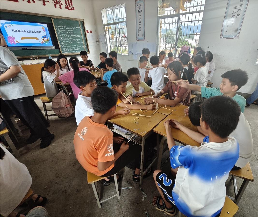 在室内活动环节,科普志愿者寓教于乐,通过动画展示、分组实操相结合的方式,为孩子们带来《投石车》《趣味奥运》《一飞冲天》等生动有趣的知识小课堂,在传授科学知识的同时,培养孩子们相互协作、互帮互助的品格。